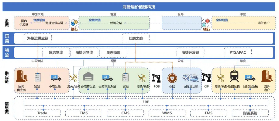 海捷运价值链提供全球化的供应链及物流服务,从国内供应商到海外客户端全方位服务,包括起运地至目的地的物流,从海外客户至国内供应商的金流与贸易流,从贸易系统至财务系统的信息流,海捷运价值链不同主体间扮演者不同角色,为客户提供无缝对接的全能型供应链服务,解决整条跨境供应链中所有的贸易、海空运、派送、仓储、分拨、通关、保险、代采、垫资、押汇、汇兑等各种服务,为全球工厂的产业供应链一体化发展提供技术与服务支持。